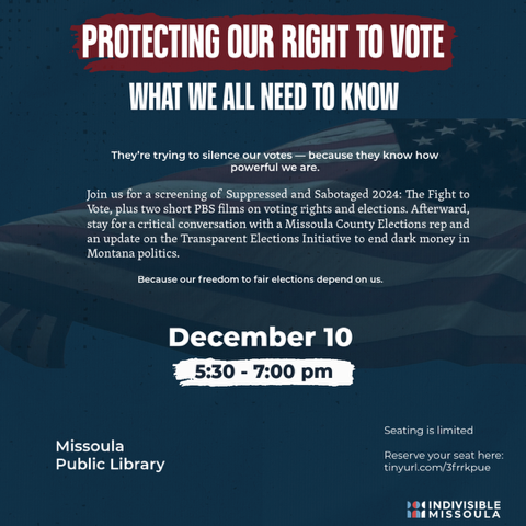 Our votes hold power, otherwise they wouldn’t subvert them. We must raise our voices in the 2026 midterms and elect leaders who represent all of us, not just the billionaires. In preparation, Indivisible Missoula will be screening a powerful film and two PBS shorts on Wednesday, December 10th from 5:30-7pm at the Missoula Public Library's Cooper Room B. After the screening we will have a discussion and Q&A with a representative of the Missoula County Elections Office on Montana's elections procedures and regulations as well as challenges on the horizon. We will also hear an update on the Transparent Election Initiative that aims to end corporate dark money spending in Montana elections.