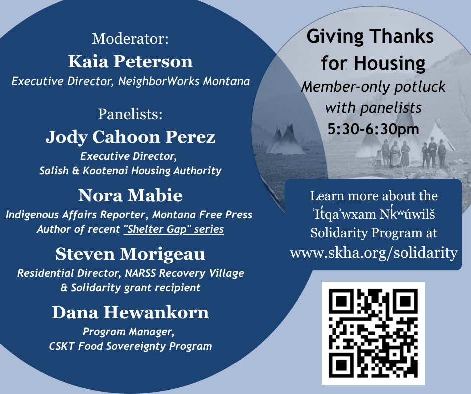 The ʾIt̓qaʾwxam Nk̓ʷúwilš Solidarity Program <https://skha.org/solidarity/> invites the public to a free Thanksgiving season event on November 21. This innovative program provides Missoula area residents opportunities to learn about and build respectful relationships with the traditional stewards of this land while supporting access to housing.