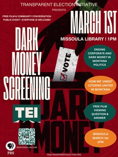 In Montana, we have a unique opportunity to end corporate and dark money in our state and break the stranglehold of big money in our politics. The Montana Plan is an innovative approach to "undo" Citizens United in Montana. On Sunday, March 1st at 1pm in the Missoula Public Library's Cooper Rooms, Indivisible Missoula will screen the film Dark Money. Then we will discuss the film and hear from Jeff Mangan, architect of The Montana Plan and founder of the Transparent Election Initiative. https://mobilize.us/s/B4PZFl to register.